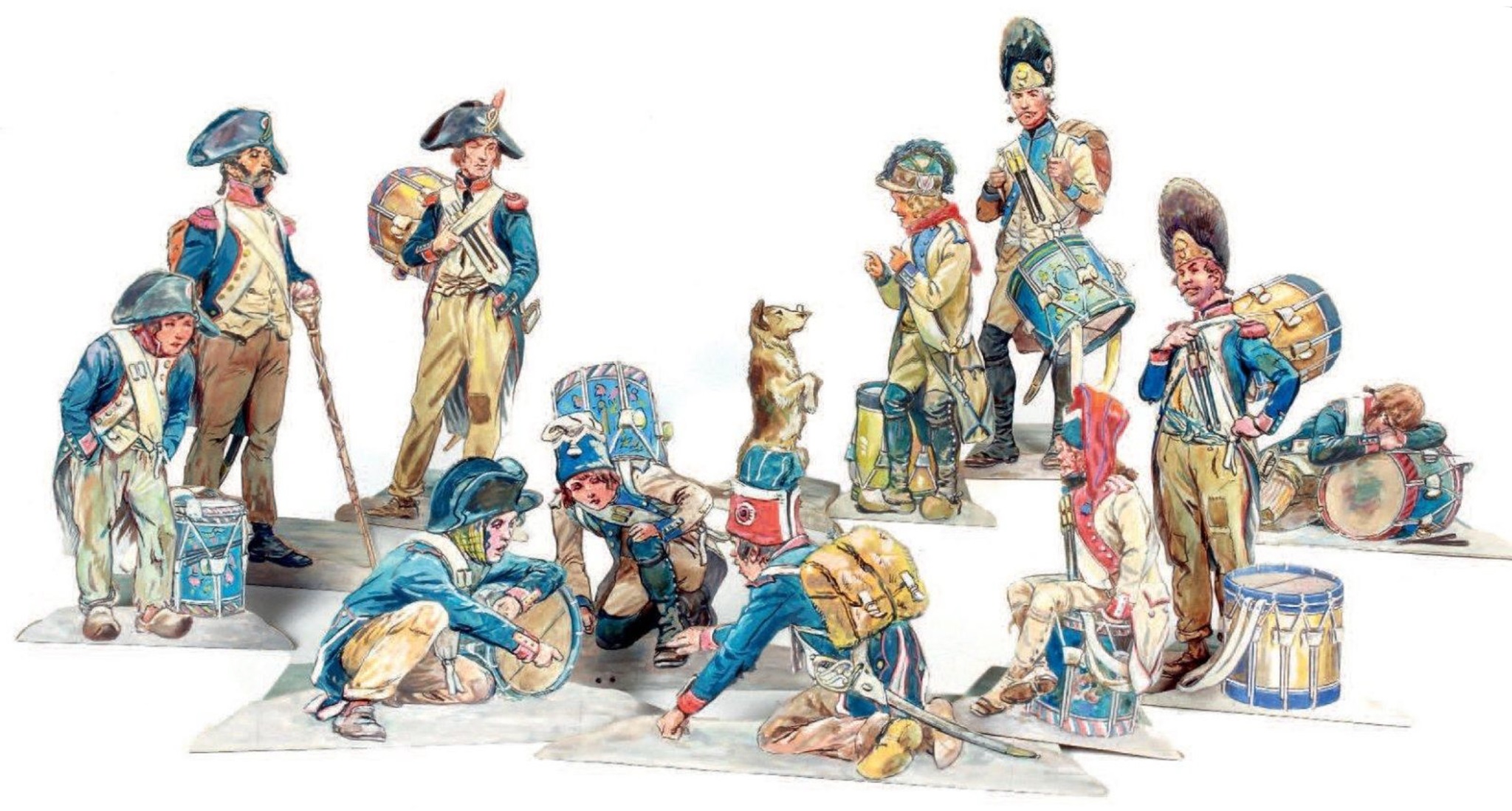 Die Figuren sind stets von Hand gezeichnet und coloriert, aus Karton ausgeschnitten und auf Sperrholz augeklebt worden. Ihre Größe reduziert sich perspektivisch.