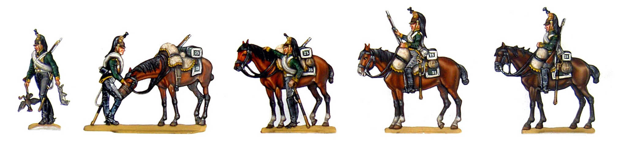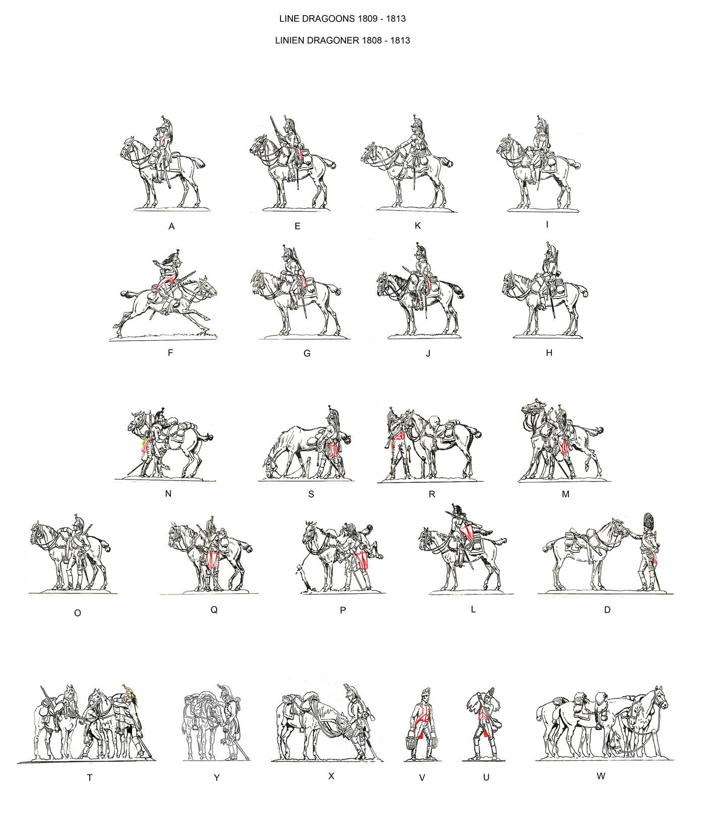 The figures had been designed originally in the uniform according to the 1812 „Bardin“ regulations which in fact haven´t been used widely before 1814/1815. Until 1813 (incl. the dragoon units coming back from Spain in1813) the dragoons wore the older cut of long tails etc. Now all moulds have been changed accordingly by Mr. Lepeltier. Changes are marked in red on the line-drawings shown.
