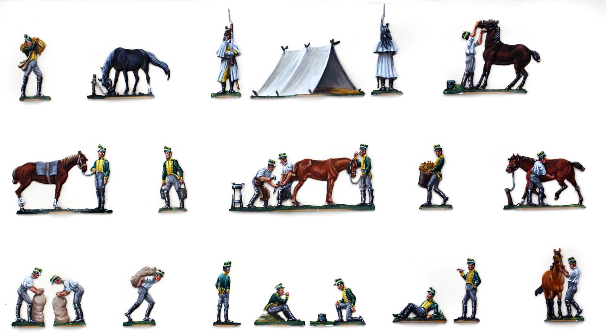 Der neue Trompeter ist nach einer Zeichnung von Leliepvre graviert, die mir freundlicherweise von Herrn Becavin, dem Inhaber von Quadri Concepts zur Verfügung gestellt wurde. Der aufsitzende Offizier basiert ebenfalls auf einer Zeichnung Rousselots (ursprünglich ein Kürassier für das Scheibert´sche Lager) die aber niemals umgesetzt wurde. Nicht geändert werden konnte der Trompeter „C“ der die kaiserliche Livree trägt .
