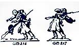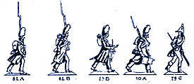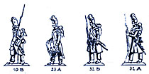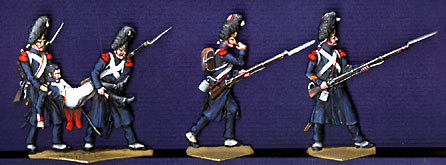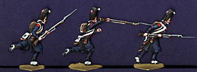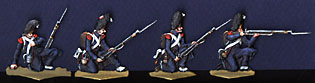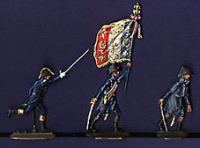 Diese Figuren in frontaler Haltstellung gehören zu einer Serie, die die Begegnung Napoleons mit dem 5. Linieninfanterieregiment nach seiner Rückkehr von Elba darstellen soll. Sie ergänzen die Brandt-Serie sehr gut. Der Pfeifer auf dem Bild rechts gehört zu der Brandt-Serie. Ein dazu gehöriger frontal stehender Offizier und ein Fahnenträger sind jedoch weniger gut gelungen (o. Abb.).