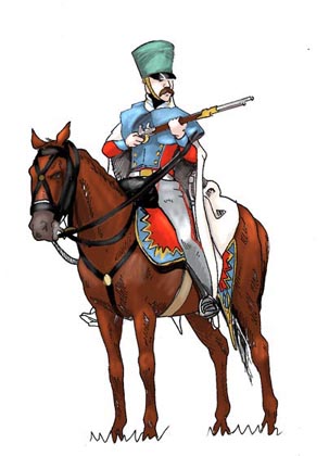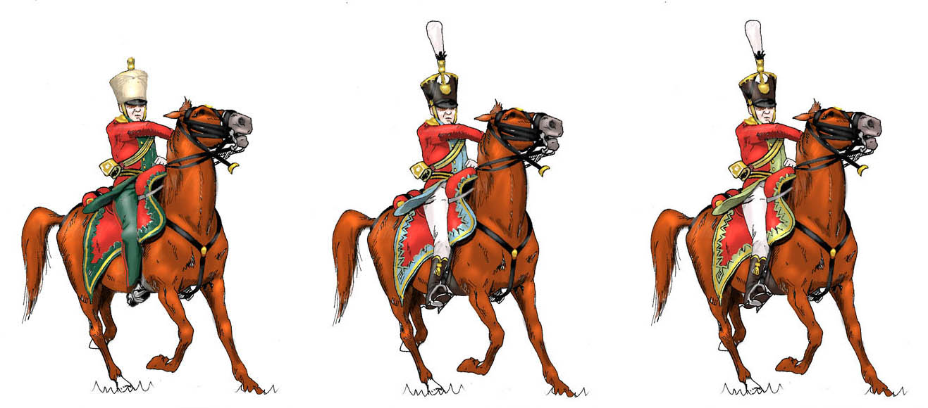Webbing was white for troopers, mixed silver/carmine for officers. Golden epaulettes, badge of rank otherwise as for French Light Horse.
