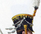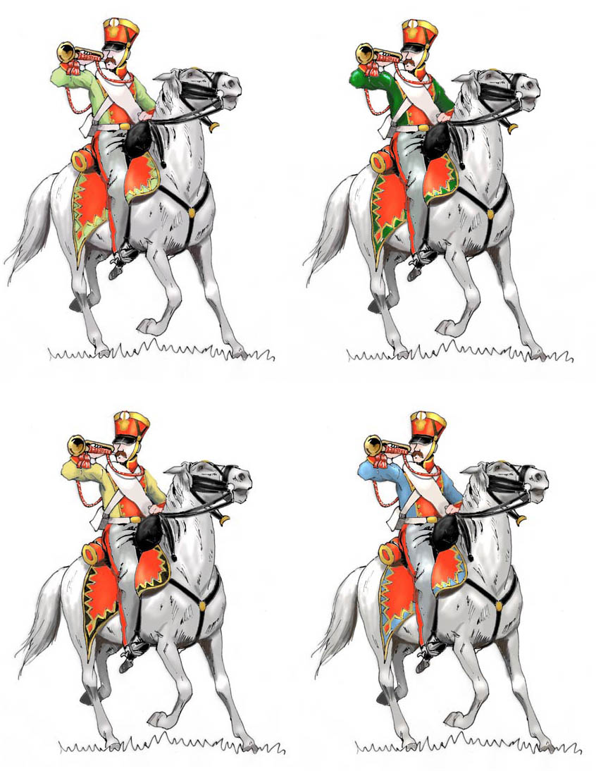 Die Trompeter trugen Tschakos von roter Grundfarbe mit gelber Borte am oberen Rand. Roter Stutz, für die „große Uniform“, jedoch kein Pompon.