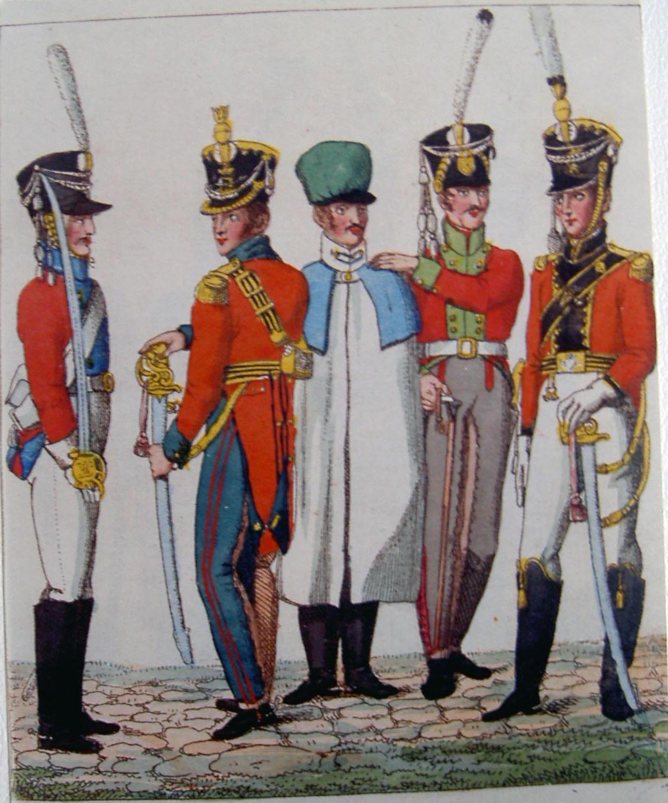 Grundfarbe rot und Schnitt ähnlich dem der französischen Jäger zu Pferd (Bardin 1812) mit folgenden Abzeichenfarben an Kragen, Rabatten, Auf- und Umschlägen: